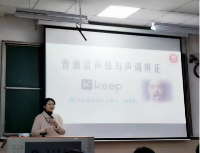 培训进入声母正音环节,陶馨怡列出五组容易混淆的声母,在向大家展示每组声母发音的细致区别后,她引导在场同学进行字词和短文朗读的挑战训练,在给予肯定的同时,也指出其中发声存在的典型问题。谈到平翘舌音辨正方法,她结合自身经验分享了诸多实用有效的小技巧,如代表字类推法、声韵拼合规律等,希望能够为同学们的发音练习提供帮助。