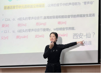 陶馨怡利用趣味横生的方言视频,说明规范普通话发音的重要性,并借此导入主题。随后,她向大家普及音节构成的基本知识,并对声母的分类进行详细讲解,指出声母分为零声母和辅音声母,辅音声母按发音部位又分为双唇音、唇齿音等七类。为让同学们更直观了解声母发音,陶馨怡带领大家朗读词组和绕口令,现场同学明确发音技巧,达到较好的训练效果。