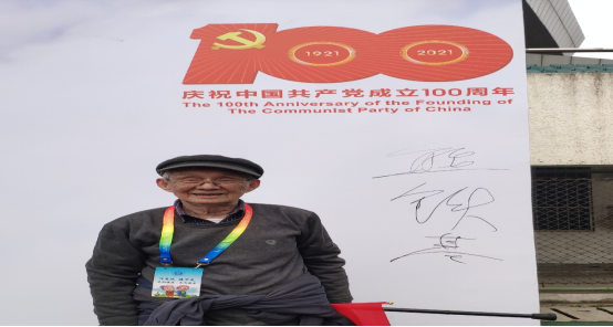 米寿之年的熊铁基老师笑着表示尽管自己的年纪大了,但心态仍十分年轻。他还在文化墙上龙飞凤舞地写下自己的名字,表达建党百周年的欢欣之情。