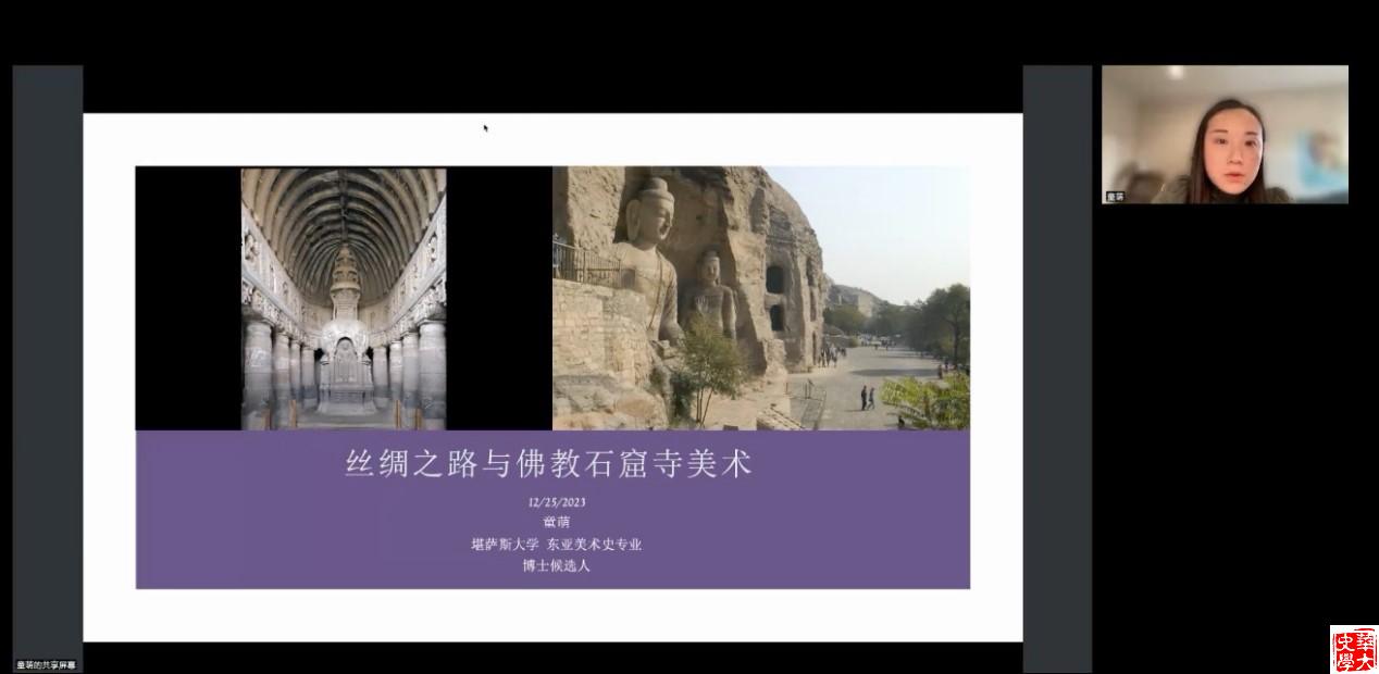 2023年12月26日上午8时,受yl7703永利官网文化学系及楚学研究所副教授傅玥老师的邀请,来自美国堪萨斯大学东亚美术史专业的童萌博士,在腾讯会议上以网络授课的形式为“汉唐考古”课堂的同学们做了一次关于“丝绸之路与佛教石窟寺美术”的专题讲座。